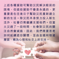 筆者朋友有年長親人獨居於宏福苑,幸好火勢沒有蔓延到她住的單位,躲在家中廁所13小時後獲救送往醫院,因吸入濃煙到現在仍需留院。因當事人是獨居,加上仍在醫院,我便陪同朋友四出奔走,代他親人向各政府部門、社關機構申請提供給災民的應急錢和緊急援助,也免費領取了一些備用的衣物、鞋和毛巾等物資,醫務社工也積極協助當事人申請中轉屋作為臨時居所。