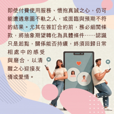 此現象促使我們反思現代交友的本質與途徑。許多人在尋覓伴侶時,容易抱持理想化的期待,盼望對方符合所有條件。然而,即使參加者在配對時填寫的收入、職業等資料屬實,人生狀態本就可能會發生改變。因此,選擇交友服務的成年人,除了需調整心態、合理看待期望之外,更應保持理性,謹慎保護個人財產與情感。新聞中的案例正好提醒我們,即使付費使用服務、懷抱真誠之心,仍可能遭遇意圖不軌之人,或面臨與預期不符的結果。尤其在簽訂合約前,務必細閱條款,將抽象期望轉化為具體條件。例如,若希望認識喜愛跑步者,可明確列明「每週戶外跑步三次、每次至少三十分鐘」,以減少後續爭議。其實交友配對服務僅是與人認識的媒介之一。人們渴望建立的真誠關係——無論是友情或愛情——關鍵仍在於相互理解與真實相處。認識只是起點,關係能否持續,終須回歸日常相處中的感受與磨合,以清醒之心迎接友情或愛情。