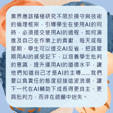 業界應該積極研究不限於操守與技術的倫理框架,引導學生在使用AI的同時,必須提交使用AI的過程,如何演進及自己在作業上的貢獻﹔每天或每星期,學生可以提交AI反省,把該星期用AI的感受記下,以培養學生批判的意識,提升運用AI的道德水平,讓他們知道自己才是 AI的主導我們要築起這道AI倫理圍牆,才能讓學生安心使用AI工具,讓AI真正成為學生學習的好幫手,而非被AI取代。今天,我們要以負責任的態度迎接這波浪潮,讓下一代在AI輔助下成長得更自主、更具批判力,而非在疏離中迷失。