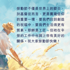勞動節不僅是世界上的節日,於基督徒而言,更是實踐信仰的重要一環,要我們回到創造的祝福中,要我們生活得更有質素。耶穌是工匠,但祂在辛勞的工作中也與上帝有美好的關係。祝大家勞動節快樂!