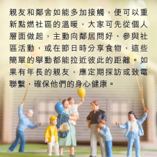 要扭轉這種局面,重建鄰舍關係至關重要。親友和鄰舍如能多加接觸,便可以重新點燃社區的溫暖,大家可先從個人層面做起,主動向鄰居問好、參與社區活動,或在節日時分享食物,這些簡單的舉動都能拉近彼此的距離。如果有年長的親友,應定期探訪或致電聯繫,確保他們的身心健康。而在社區層面,政府和非牟利組織可舉辦更多活動,如義工探訪、鄰里聚會或健康檢查,促進居民之間的互動。