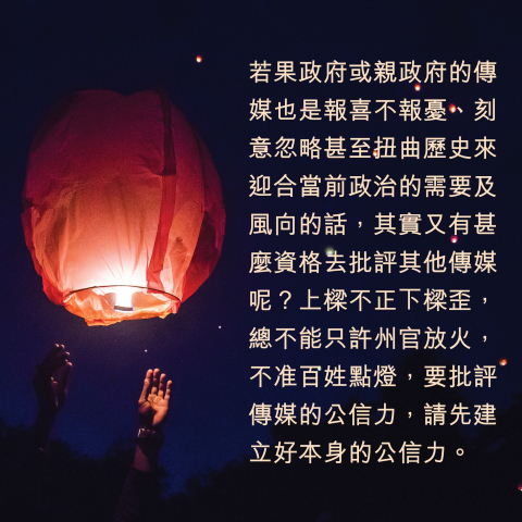 當然,對於新聞界來說,其影響力與普通的民間團體和個人不同,政府不能視若無睹,有時的確需要及早回應,但回應不等如要開火,雖然不幸的是有些傳媒機構及其老闆都有既定的政治立場,有些老闆更將傳媒當作推銷個人政治取態的工具,在許多的報道上立場先行,根本不能客觀公正,只是譁眾取寵、為達目標、不擇手段。這些濫用新聞自由去達到個人目標的手段,縱然目標正確,但當手段出了問題,最終亦只會造對新聞自由和公信力的損害,得不償失。傳媒要贏得公眾的信任,就應該客觀地報道社會上的不同聲音,刻意忽略或扭曲與本身立場不同的聲音,或者將傳媒當作宣傳工具的老闆或傳媒主管,就算有多崇高的理想,都只會好心做壞事。不過,若果政府或親政府的傳媒也是報喜不報憂、刻意忽略甚至扭曲歷史來迎合當前政治的需要及風向的話,其實又有甚麼資格去批評其他傳媒呢?上樑不正下樑歪,總不能只許州官放火,不准百姓點燈,要批評傳媒的公信力,請先建立好本身的公信力。