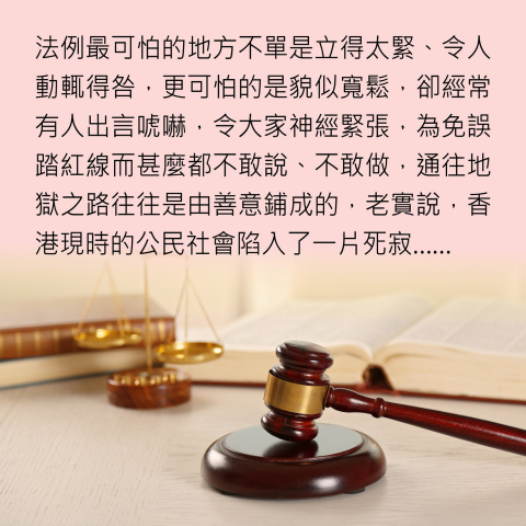 過去幾年香港的社會情況已回復穩定,不少憂慮人身安全和難以接受現況的人已選擇了離開,留下來的人很多可能對政治根本沒有興趣,只希望可以與家人朋友自由自在地生活,做自己喜歡的事,毋須終日提心吊膽。而最能體現這種生活精粹的就是言論自由,大家可以暢所欲言、睇戲唱K,不用經常擔心會被人篤灰(其實被篤也沒有問題,只要執法的人不會小題大做,有殺錯冇放過,將吹哨人當作搗亂份子便上上大吉)。但現實是有些人經常將打擊軟對抗掛在嘴邊,而大家又不知道紅線劃在哪裡,要終日揣摩上意,擔心會以言入罪,這又有甚麼自由可言?法例最可怕的地方不單是立得太緊、令人動輒得咎,更可怕的是貌似寬鬆,卻經常有人出言唬嚇,令大家神經緊張,為免誤踏紅線而甚麼都不敢說、不敢做,通往地獄之路往往是由善意鋪成的,老實說,香港現時的公民社會陷入了一片死寂,仍然留港的人對批評政府的施政如履薄冰,戰戰兢兢,令不少法例和社會政策未經充份討論便倉卒出台、千瘡百孔,甚至要腰斬,對社會和國家的穩定和安全帶來更大的負面影響。安全不是咒語、不是口號,而是感覺,當大家真正有安全感的時候,安全是毋須日日掛在嘴邊的,許多人的不滿情緒只要有適當的途徑宣洩(例如亂噏)便可以化解不少,若果因為憂慮而甚麼批評也不敢宣之於口的話,最終政府只會因為很少聽到不同的聲音而自我感覺良好,閉門造車,無法將嚴重的錯失防範於未然,與真正的安全背道而馳,愈講安全愈不安全。