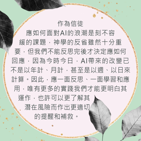 AI和機械人的發展速度之快、應用之廣,勢不可擋,今年春晚的機械人表演技驚四座、令人十分震撼,無論大家是否喜歡、是否擔憂相關的發展亦難以阻止。當大家擔憂AI會否失控,出現科幻小說所描述的智能叛變;或者AI會否受人類影響變得狡猾,令許多事真假難辨,有圖有片有聲亦沒有真相;更現實的是科技會否成為別有用心的人士或政府監控和煽惑他人的工具?市民大眾的隱私十分脆弱,對於政府和大企業亦沒有足以抗衡的議價能力,在AI面前我們的確十分渺小,這些從前科幻小說描述的不同現象其實已經不同程度地降臨了。作為信徒應如何面對AI的浪潮是刻不容緩的課題,神學的反省雖然十分重要,但我們不能反思完後才決定應如何回應,因為今時今日,AI帶來的改變已不是以年計、月計,甚至是以週、以日來計算。因此,應一面反思、一面學習和應用,唯有更多的實踐我們才能更明白其運作,也許可以更了解其潛在風險而作出更適的提醒和補救。