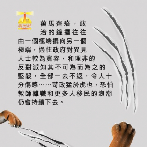 香港已進入官媒治港的年代,只要官媒將某些團體定性為「毒瘤」,特區政府便急不及待配合,親建制組織便統一口徑口誅筆伐,當然,更有不少所謂消息人士不斷放風,指出有關團體及人士「唔識做」的話會有甚麼嚴重後果,情況和早前二百多名區議員主動請辭相近,恐怕其他在政治上有影響力的反對派未來亦會面對類似情況,陸續解散和停止運作,萬馬齊瘖,政治的鐘擺往往由一個極端擺向另一個極端,過往政府對異見人士較為寬容,和理非的反對派知其不可為而為之的堅毅,全部一去不返,令人十分傷感!若政府堅持對一個有超過9萬會員的教師工會秋後算賬,要以威嚇的手段令一些反對派主動解散,之後仍不排除繼續追究,得勢不饒人的話,只會營造嚴苛的政治氣氛,怎能不叫人心寒、甚至心死!苛政猛於虎也,恐怕教師離職和更多人移民的浪潮仍會持續下去。