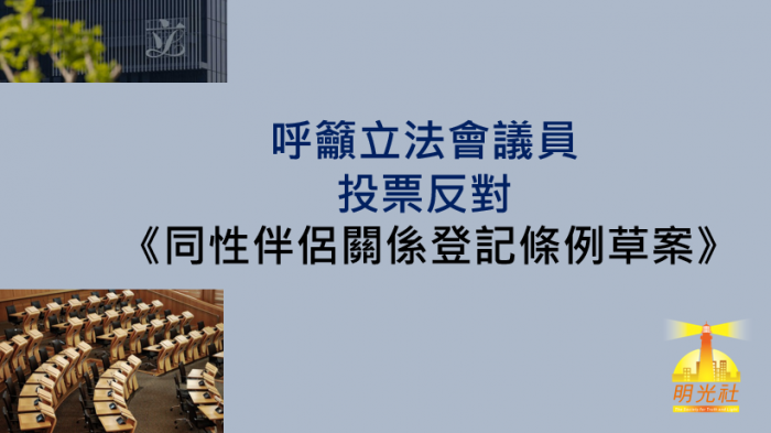 明光社一直關注同志議題對家庭價值與兒童福祉的影響,就立法會即將就《同性伴侶關係登記條例草案》進行二讀辯論,本社特此致函,懇請閣下在投票時反對該草案,以維護香港的婚姻核心價值和兒童福祉。