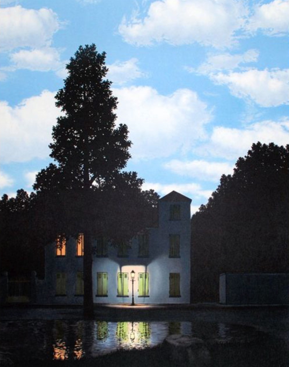在《光之統治》中,白晝與黑夜同時存在於一幅畫裡,若《望遠鏡》揭去幻象以顯示黑暗,這裡則讓光與暗和諧共存。上方的藍天似乎是真實的,但下方的世界卻未能映照它,彷彿現實的倒影出錯,產生兩個互不相容卻同樣成立的真相。我們的思維本能地追求一致,若天空明亮,地面和水中倒影也該明亮。然而馬格利特卻拒絕這種邏輯,他把兩種互斥的光源並置,打破了「自然秩序」。原來我們所謂「自然」只是心智加諸世界的概念。《望遠鏡》揭穿了「統一」的幻象,《光之統治》則揭穿了「一致」的幻象。兩者都質問:人類的視覺真能掌握世界本相嗎?