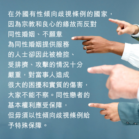 至於是否訂立性傾向歧視條例,必須先考慮同性戀群體在香港是否受到特別不公平的對待,以至需要用獨立的平等機會條例來予以特別的保障,因為社會上有許多不同的少數或弱勢群體(例如不同宗教、政治傾向、環保信念、素食主義、難民、不同性傾向、以及跨性別……),實在多不勝數,哪個群體需要立法保護必須看看社會的實際情況,因為受平等機會條例保護的群體是會有特殊保障的,例如透過騷擾和中傷言論的條款可以處罰反對同性戀行為的人士,以及將對同性婚姻和異性婚姻的差別對待當作歧視。其實今時今日香港的同性戀者要公開身份並不會招致人身安全的問題,有些不贊成同性戀的人士面對的非理性攻擊和惡毒的謾罵可能更多,而在外國有性傾向歧視條例的國家,因為宗教和良心的緣故而反對同性婚姻、不願意為同性婚姻提供服務的人士卻因此被檢控、受排擠、攻擊的情況十分嚴重,對當事人造成很大的困擾和實質的傷害,大家不能不察。同性戀者的基本權利應受保障,但毋須以性傾向歧視條例給予特殊保障。